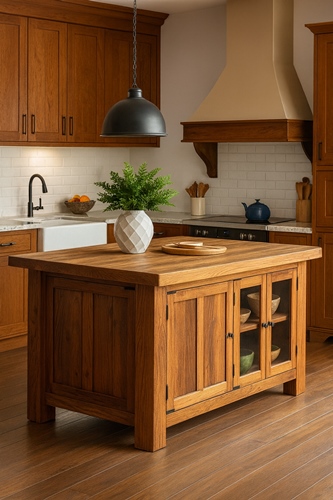 Drewniana wyspa kuchenna z szafkami to funkcjonalny i stylowy element wyposażenia każdej kuchni. Pięknie łączy w sobie naturalne piękno drewna z mobilnością i praktycznością. Wykonana z solidnego, wysokiej jakości drewna, wyspa charakteryzuje się trwałością oraz estetyką, która doskonale wpisuje się w różne style aranżacji wnętrz, zwłaszcza te o klimacie boho czy rustykalnym.